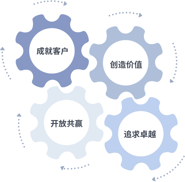 成就客户是一切决策的出发点,,,创造价值是衡量所有工作的标准,,,追求卓越是我们做事做人的态度,,,开放共赢是我们的格局也是最终的结果。。。。价值观的齿轮环环相扣,,推动着组织里的每个人不断向前。。。
